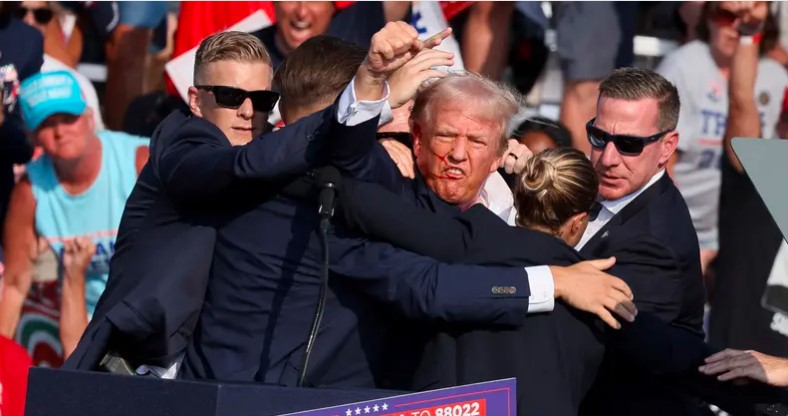 وقام عناصر جهاز الخدمة السرية على الفور باصطحاب الرئيس السابق إلى خارج موقع التجمع، بينما كانت الدماء تسيل على وجهه، حيث أصيب برصاصة اخترقت الجزء العلوي من أذنه اليمنى. وأثناء إخراجه، رفع المرشح الجمهوري للانتخابات الرئاسية قبضته أمام الحشد في إشارة تحدٍّ.