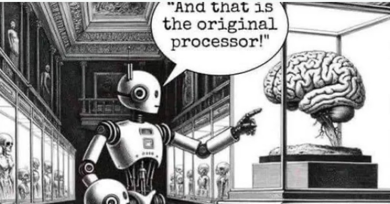 وتظهر الصورة روبوتا يشرح لروبوت آخر، يفترض أنه أصغر سنا، أن الدماغ البشري المعروض هو “المعالج الأصلي”، في تلميح إلى انقراض العقل البشري.