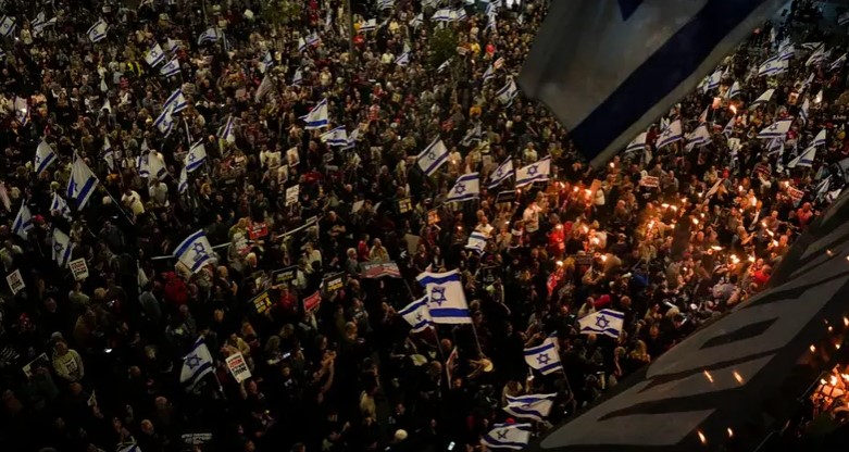 وقال المنظمون إن نحو 100 ألف شخص تجمعوا عند مفترق طرق في تل أبيب أعيد تسميته “ميدان الديمقراطية” منذ الاحتجاجات الحاشدة ضد التعديلات القضائية المثيرة للجدل العام الماضي.