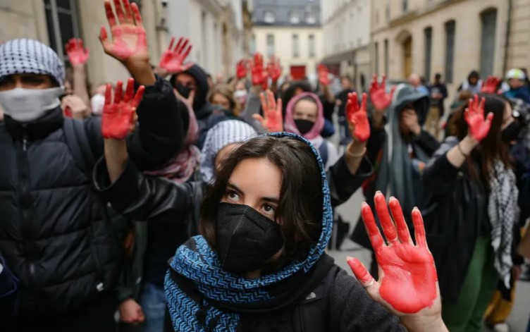 (The Turkish Post) – في معهد العلوم السياسية في باريس، أظهر ناشطون منددون بمجازر إسرائيل المستمرة في غزة، أيديهم مطلية باللون الأحمر، في إشارة إلى استمرار سفك دماء المدنيين الفلسطينيين تحت أنظار العالم.