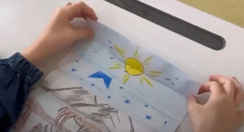 فإذا بالطفلة تقوم بتسميع الآيات عن طريق رسومات تنساب بسلاسة بين يديها، حيث تطوي كل جزء من الرسمة على حدة،
