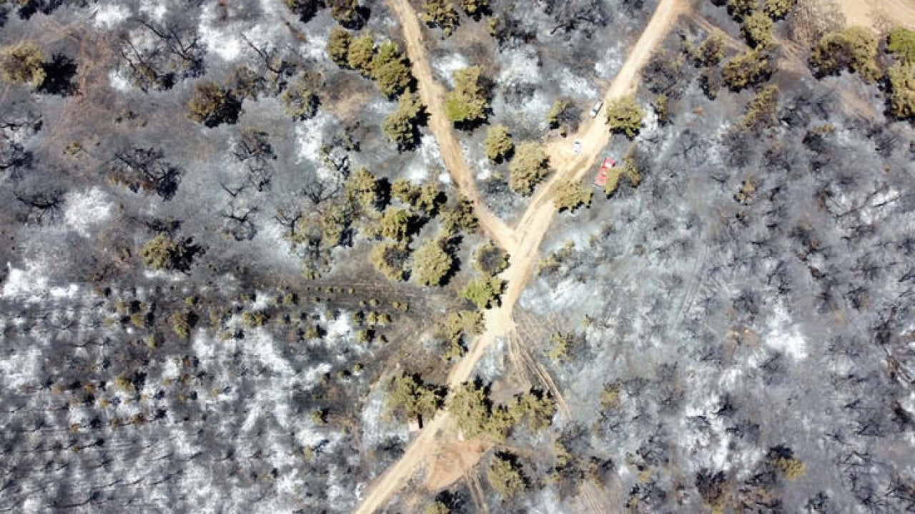 Yangında zarar gören bölge drone ile de görüntülendi.