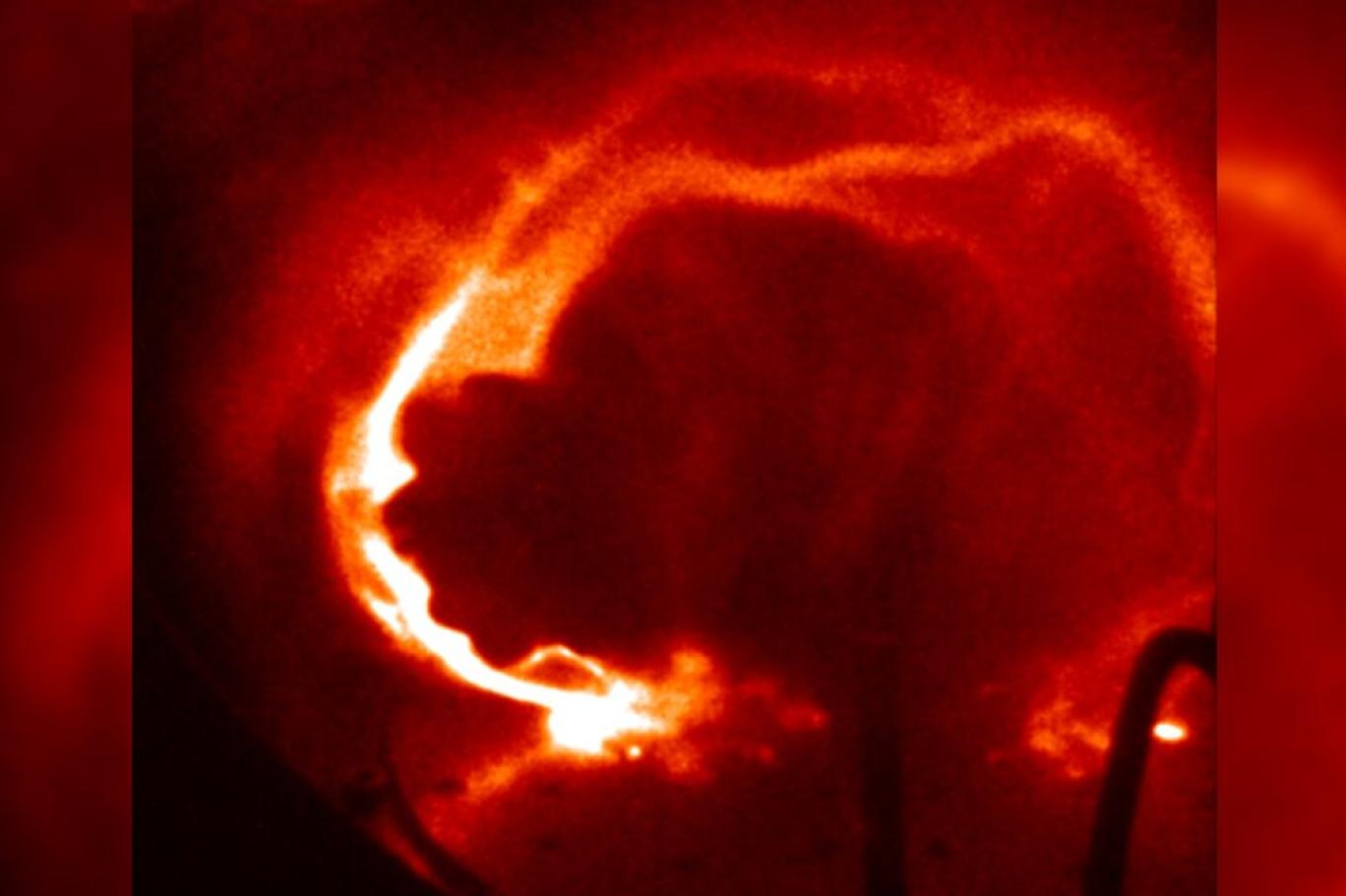 Bu plazma dizisi odanın manyetik alanı tarafından kısa bir süre boyunca döngü halinde yerinde tutuldu. Ancak sonra içine doğru çökerek dışarı doğru püsküren küçük bir parlamayı meydana getirdi.