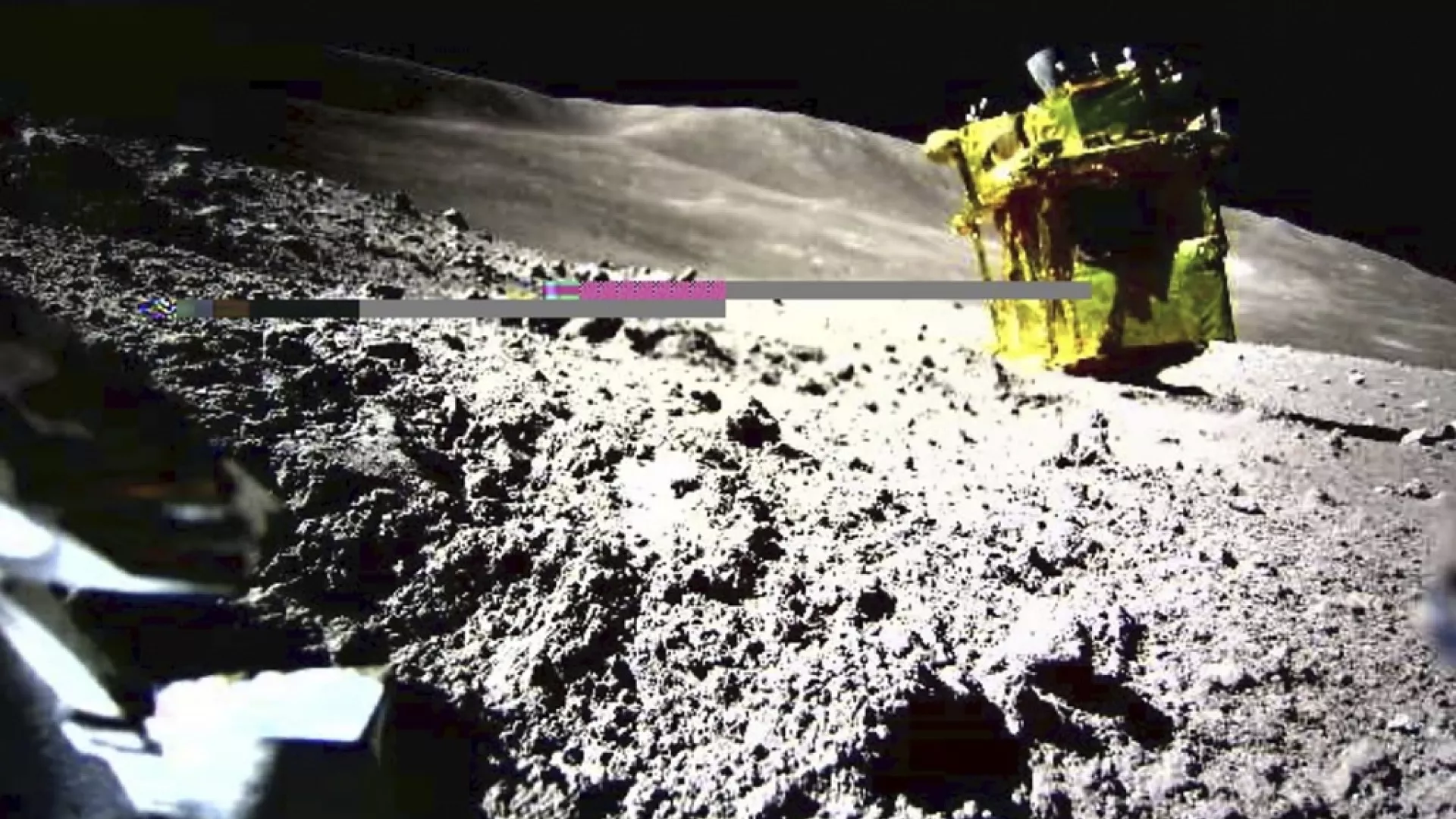 JAXA tarafından yayınlanan ve iniş sırasında SLIM tarafından konuşlandırılan beyzbol topu büyüklüğündeki ikinci bir cihaz tarafından çekilen fotoğrafta, iniş aracının Ay yüzeyindeki bir kraterin yamacında devrildiği görülüyor.