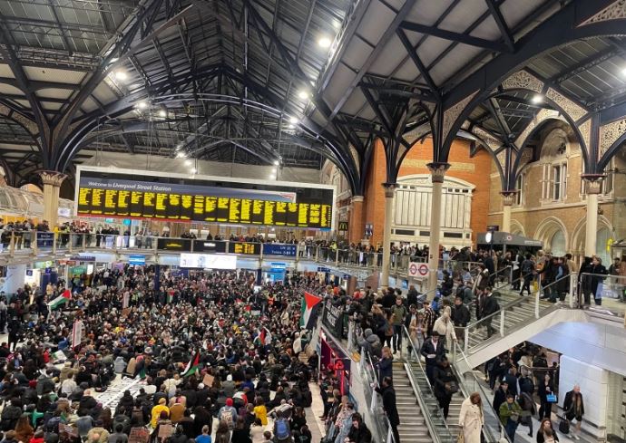 (The Turkish Post) – İsrail’in Gazze Şeridi’ne yönelik saldırılar devam ederken, dünyanın birçok ülkesinde ise Gazze Şeridi’nde derhal ateşkes sağlanması için protestolar düzenleniyor. İngiltere’nin başkenti Londra’da yüzlerce kişi, Gazze Şeridi’nde ateşkes çağrısında bulunarak, Liverpool Caddesi İstasyonu’nda oturma eylemi düzenledi.