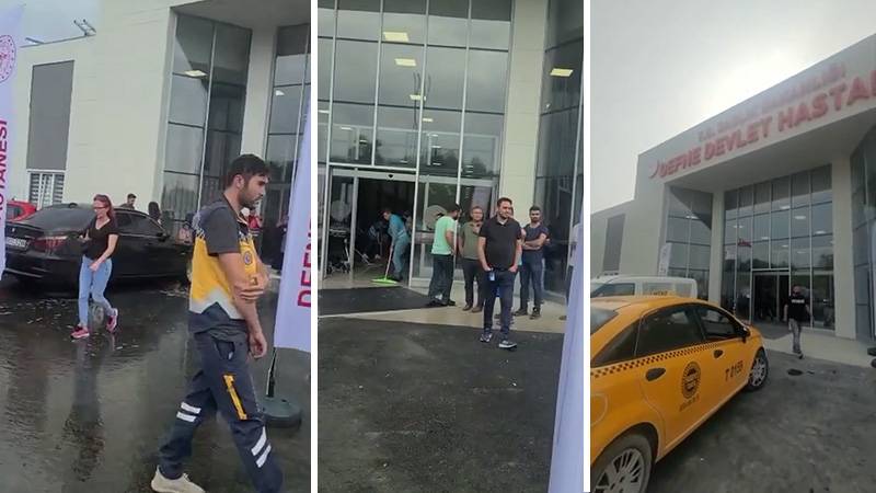 Erdoğan’ın açılışını yaptığı hastaneyi bugün su bastı. Bir vatandaş tarafından kaydedilen görüntülerde, personelin hastanenin içine dolan yağmur sularını çekçeklerle dışarı çıkarmaya çalıştığı görüldü.