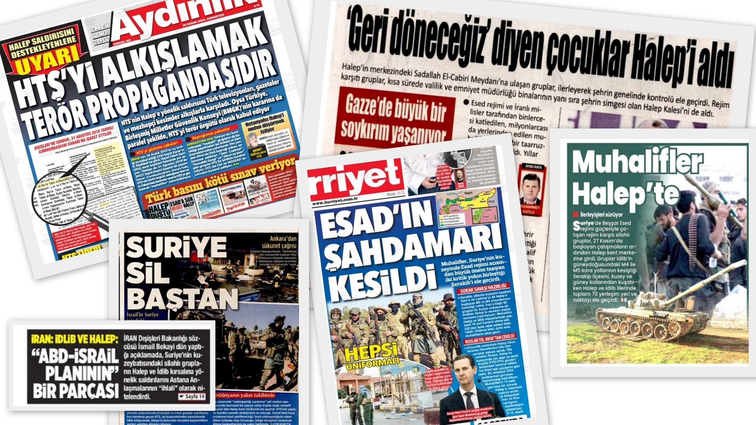 Rusya, İran ve Esad’lı Suriye destekçisi Aydınlık, HTŞ’yi destekleyenleri ‘uyardı’. “HTŞ’yi alkışlamak, terör propagandasıdır” manşeti atan Aydınlık, “HTŞ’nin Halep’e yönelik saldırısını Türk televizyonları, gazeteler ve mezhepçi kesimler alkışlarla karşıladı. Oysa Türkiye, BMGK’nin kararına da paralel şekilde, HTŞ’yi terör örgütü olarak kabul ediyor.” diye yazdı.