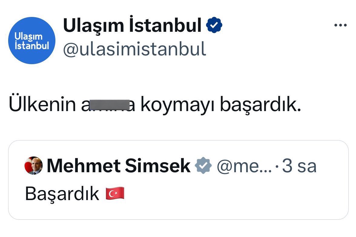 (The Turkish Post) – İstanbul Büyükşehir Belediyesinin (İBB) sosyal medya platformu X’teki resmi ulaştırma hesabından, Hazine ve Maliye Bakanı Mehmet Şimşek’in ‘Başardık’ paylaşımının küfürlü şekilde alıntılanmasına ilişkin resen soruşturma başlatıldı. Kısa süre sonra silinen mesajla ilgili olarak belediye yetkilileri ise hesabın hacklendiğini iddia etti.