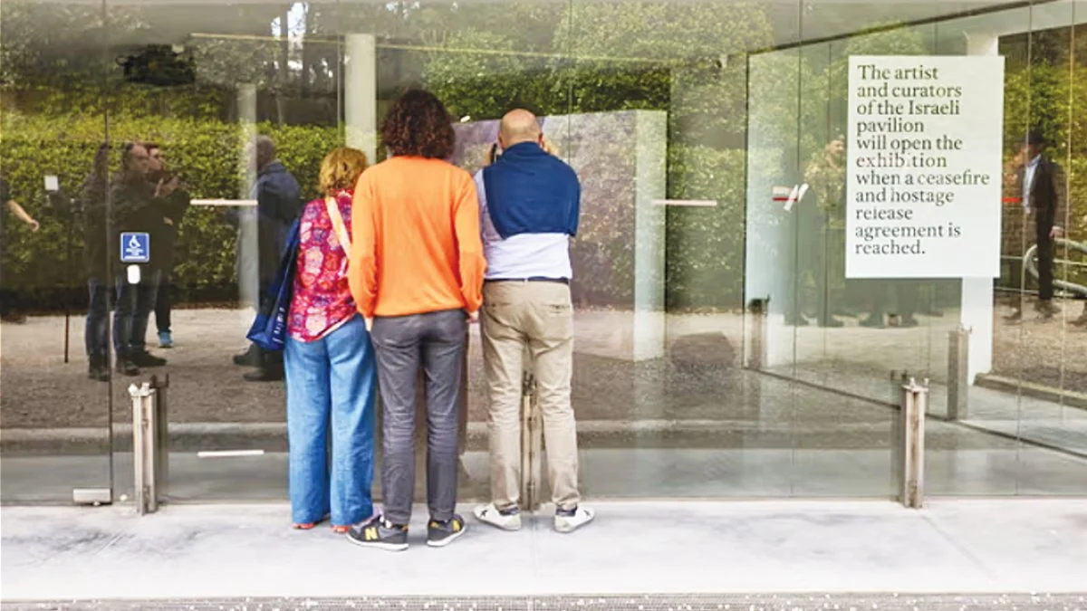 The New York Times muhabiri Alex Marshall’ın haberine göre binealde İsrail’i temsil eden sanatçı Patir ve küratörler pavyonun kapısına bir tabela bantladı. Tabelada “İsrail pavyonunun sanatçısı ve küratörleri, ateşkes ve rehinelerin serbest bırakılması anlaşmasına varıldığında sergiyi açacaklar” yazdığı görüldü.