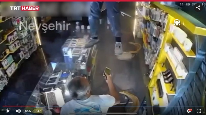 Önce ne olduğunu anlayamayan iş yeri sahibi ve müşteri, durumu fark edince adamın inmesine yardım etti. Olay, iş yerinin güvenlik kamerasınca kaydedildi.